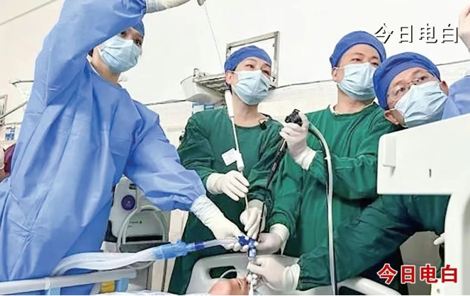 ▲省醫(yī)呼吸與危重癥學(xué)科李靜教授手把手帶教省醫(yī)粵西醫(yī)院團(tuán)隊(duì)為患者實(shí)施全麻下經(jīng)纖支鏡支架置入術(shù)(左二為廣東省人民醫(yī)院呼吸與危重癥學(xué)科李靜教授)
